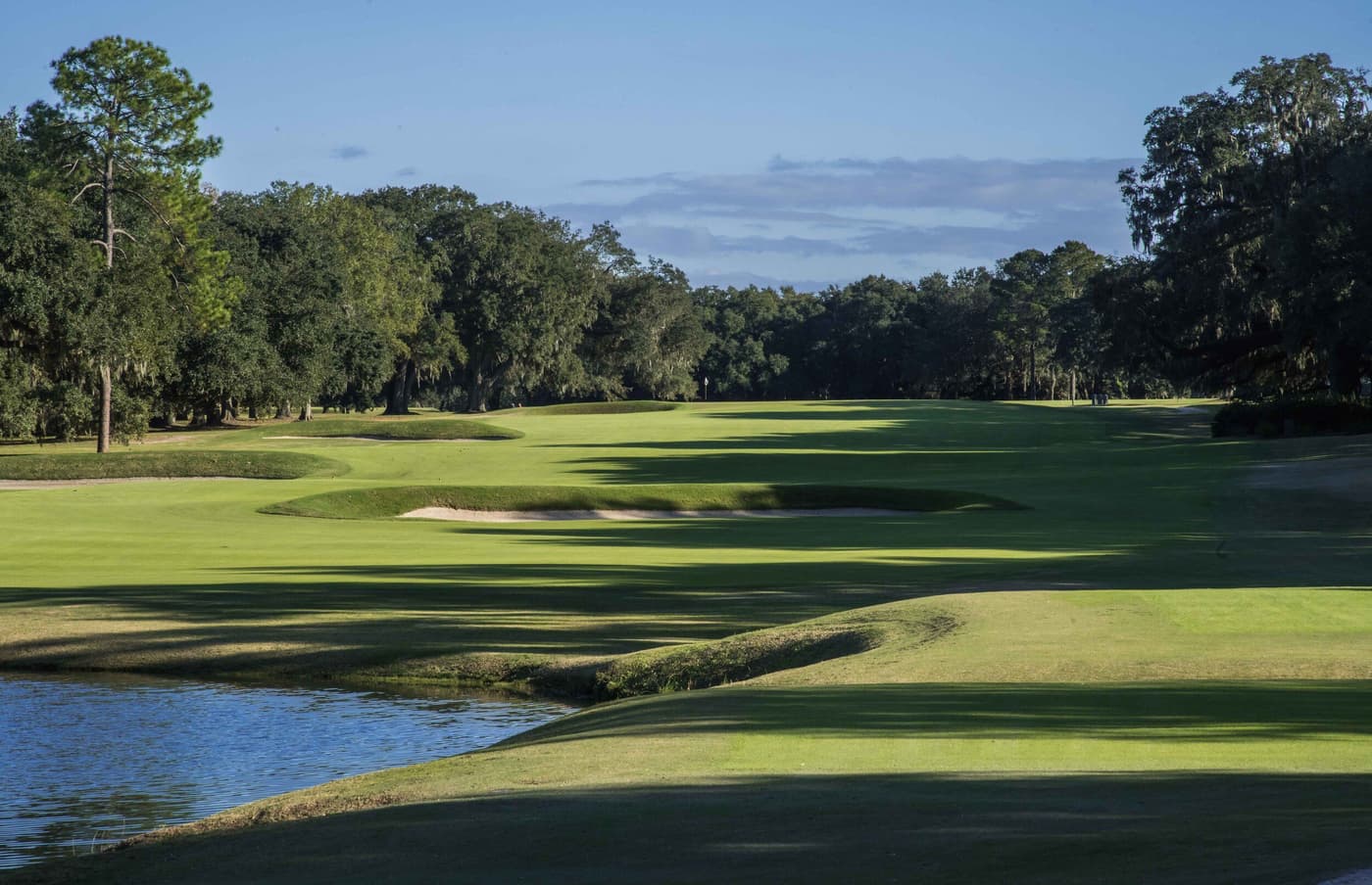 A feature hole is the par three 6th measuring 180 yards called “Redan” which, as the name implies, is a Raynor remake of the famous 15th hole at North Berwick. The narrow green slopes from right to left and is framed by magnolias and oak trees bedecked in hanging moss. Three bunkers at the back are very much in play as the putting surface slopes steeply into them.